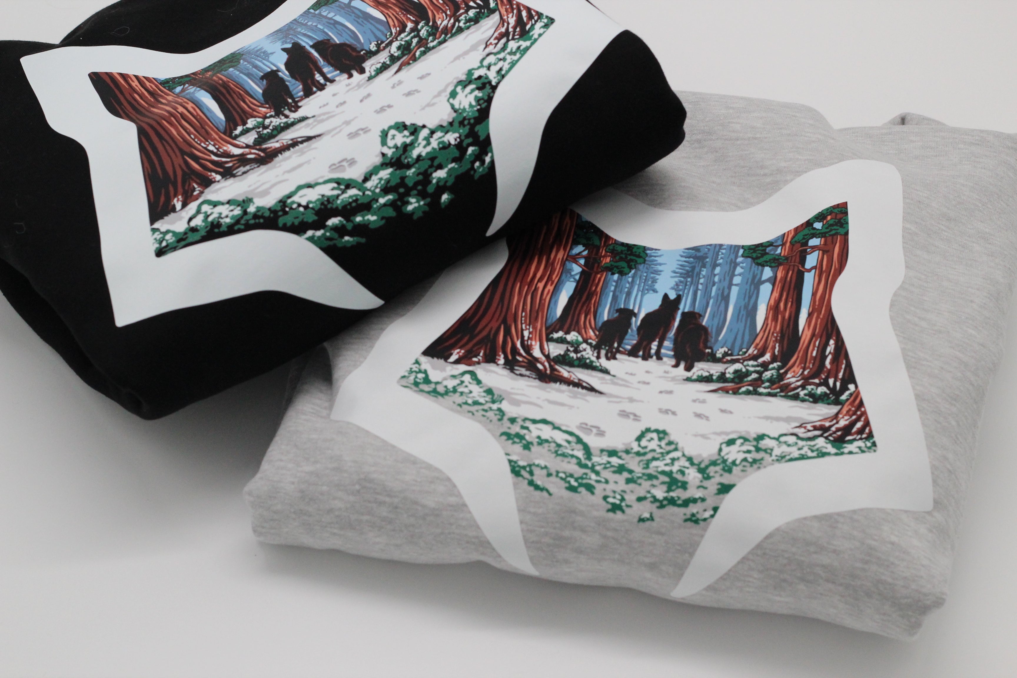 This design was inspired by the strength of sequoias and "Everwild" symbolizes the bond between owners and their dogs, capturing strength and adventure. Our design of three dogs in the distance, is a reminder that our pac never roams alone, but always together. All yarn, and fabric waste from production is reused and recycled, making this hoodie eco-friendly and safe for our environment.
