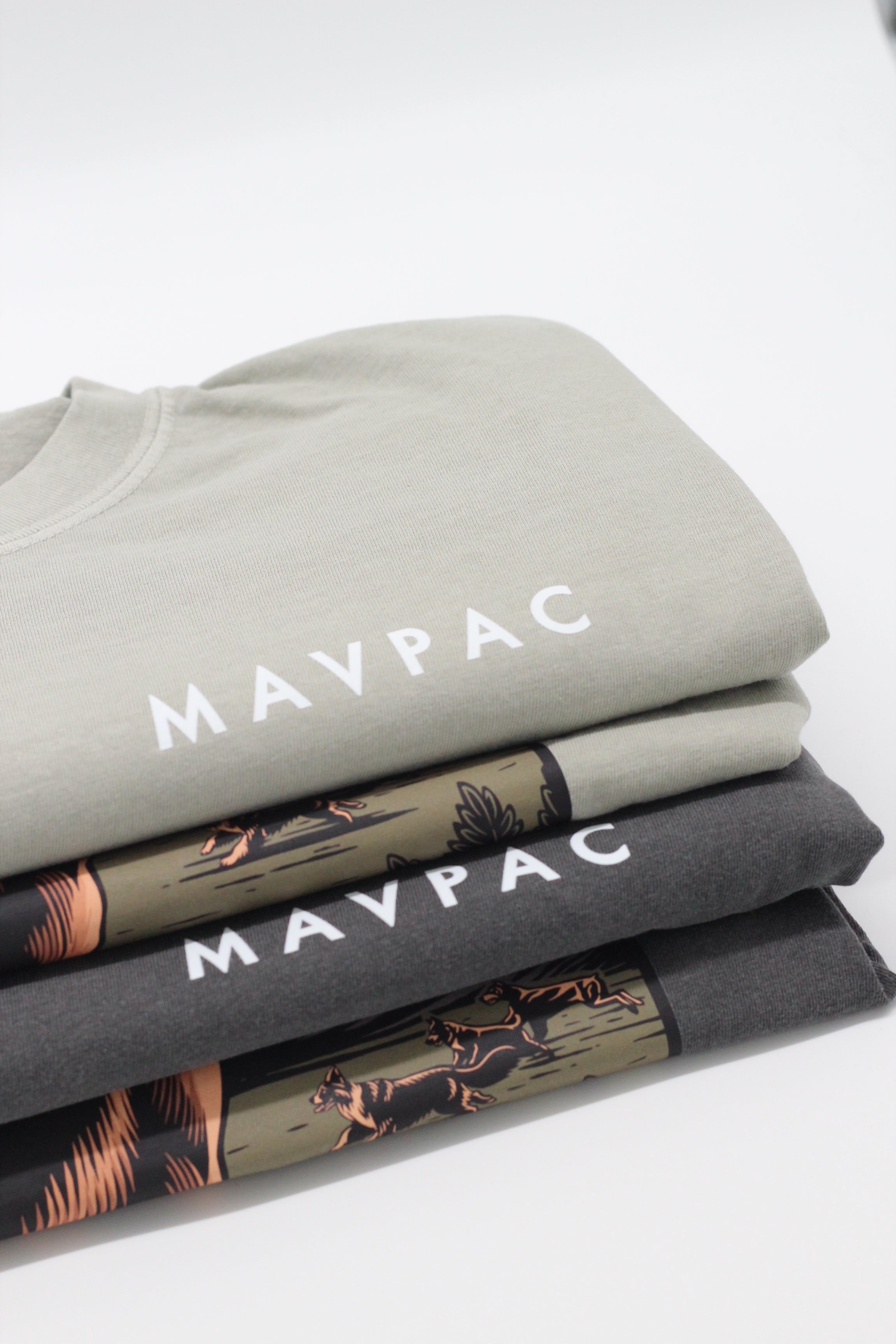 Experience unrivaled comfort with our latest MAVPAC Summit Tee, designed for both style and ease! The design of this drop was inspired by Maverick, who's watchful presence on the dogs in the distance symbolizes our MAVPAC community. Join us in embracing comfort and camaraderie during training sessions, park days and outdoor adventure, because in our PAC, we always run together.